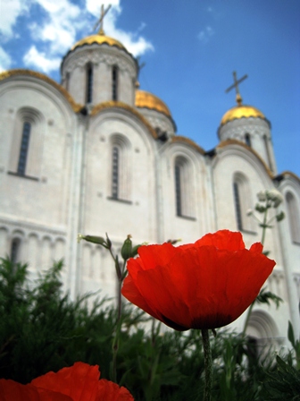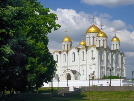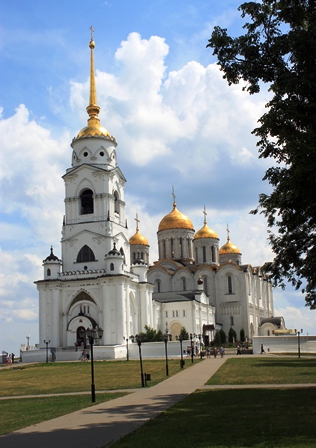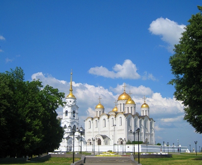 کلیسای جامع ولادیمیر: یکی از تاریخیترین و مهمترین کلیساهای ارتدوکس روسیه و چشمگیرترین بنای ولادیمیر است. یک بنای سفید رنگ با پنج گنبد طلایی و یک برج ناقوس که چشماندازش تمام شهر و اطراف آن میباشد. رنگ طلایی گنبدها زیر نور آفتاب میدرخشد. گنبد کلیساهای ارتدوکس روسی، گنبد پیازی است؛ این گنبد همان طور که از نامش پیداست، به شکل پیاز است و نوک تیزی دارد.کلیسای جامع در سال 1158 با یک گنبد ساخته و به مریم مقدس تقدیم شده بود؛ سپس در سال 1185 و به منظور شبیهسازی به کلیسای جامع سنت صوفیا در کییف، گسترش یافت و چهار گنبد کوچکتر به آن اضافه شد و تا حدود 300 سال بعد، بزرگترین کلیسای روسیه باقی ماند. کلیسا در قرن 13 و 14 میلادی، مادر کلیساهای روسیه به شمار میرفت و تاجگذاری شاهزادگان روس در آن صورت میگرفت. داخل کلیسا، اولین بار در قرن دوازدهم نقاشی شده بود و با وجود آن که خوشبختانه برخلاف دیگر کلیساهای شهر، از آتشسوزی ویرانگر مغولها در امان ماند، مجدداً در قرن پانزده توسط «آندری روبلوف» مشهور و «دانیل چورنی» نقاشی گردید. دیوارهای خارجی کلیسا با کندهکاریهای زیبا پوشیده شده و برج ناقوس، که ترکیب جالب روسی سبکهای گوتیک و نئوکلاسیک است، در سال 1810 ساخته شد. آندره بوگالوفسکی، سِوولاد یورییویچ و دیگر شاهزادهها و حاکمان ولادیمیر و سوزدال، در این کلیسا به خاک سپرده شدهاند. عکسبرداری از داخل کلیسا ممنوع است. تماشای مجسمه یادبود «آندری روبلوف» در نزدیکی میدان کلیسا نیز، خالی از لطف نیست.